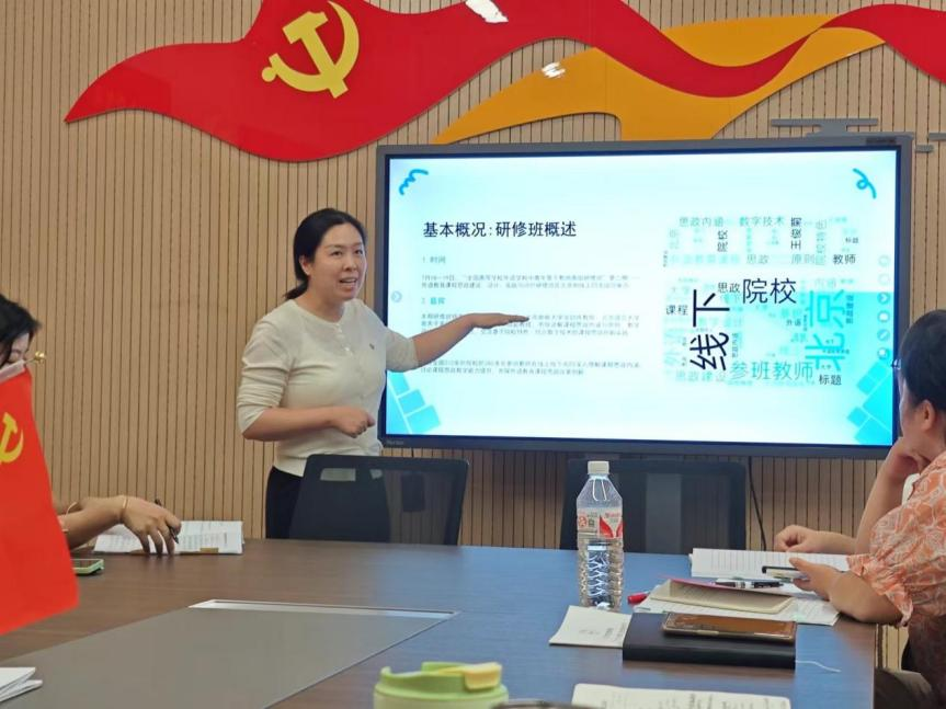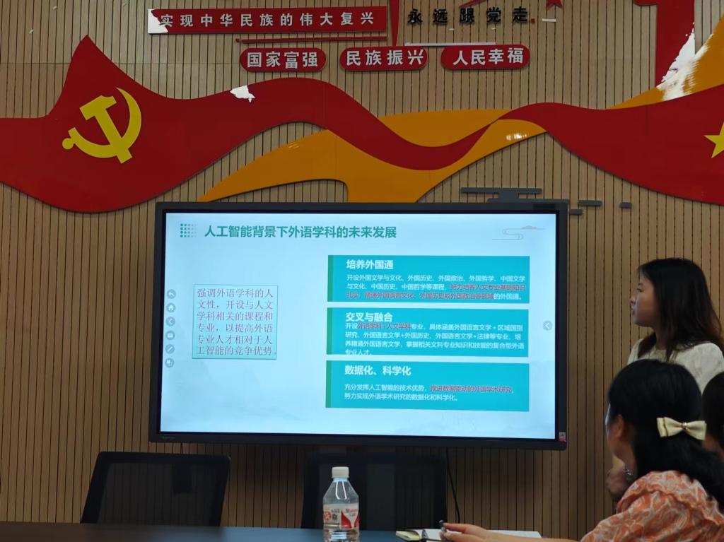 石从红、张乐玥老师分享了观摩外研社“教学之星”大赛的体验,不仅分析了比赛的内容和形式,还深入探讨了AI技术如何与英语教学相结合,以及如何将教学模式从传授者转变为促进者。杨杨老师则分享了“外语教育课程思政建设”研修班的要点,强调了教学设计应遵循的原则,并展示了如何将产出导向法应用于思政教学设计,介绍了数智赋能课程思政的创新设计方案,并通过实际案例讲解了如何挖掘教材内容中的思政点,为教师们提供了新的教学思路。方明丹老师分享了卓越外语教师发展论坛的学习体会,介绍了人工智能背景下的外语学科的未来发展,探讨了人工智能给外语学科带来的挑战和机遇,强调外语学科的人文性。