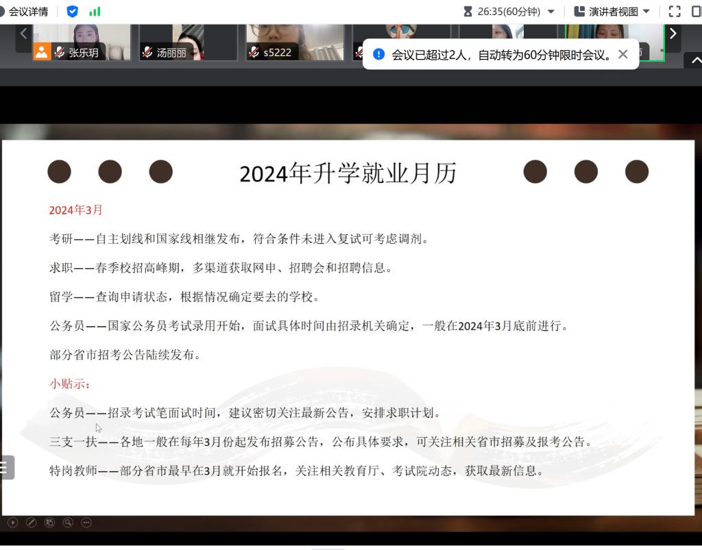 24届毕业班召开线上就业主题班会,为毕业生同学分析形势、历年就业情况、考研考公形势、各类民营企业岗位需求等内容,帮助2024届毕业生树立正确的择业观,抓住春招的求职黄金期,主动参加校园招聘活动。
