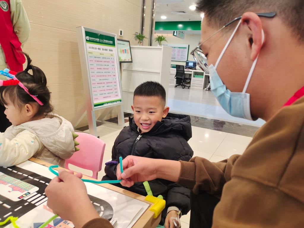 在门诊大厅,志愿者们提前熟悉医院就诊流程、科室分布及自助设备使用方法,化身“移动指引员”。他们耐心解答患者咨询,协助查询就诊信息、操作挂号缴费设备,引导患者有序前往诊室、检查室及药房,有效缓解了门诊就诊压力。与此同时,儿童病房内一派欢声笑语。志愿者们带着色彩鲜艳的扭扭棒和造型多样的积木,与患病儿童们开启了创意之旅。在志愿者的手把手指导下,孩子们发挥想象力,将扭扭棒缠绕、拼接成花朵、小动物、卡通形象等可爱作品;积木区里,大家相互协作,搭建出城堡、汽车、桥梁等各式造型,沉浸在动手创造的乐趣中。原本因治疗而略显沉闷的病房,被孩子们的笑声与创意填满,每一份作品都承载着他们的童真与对美好生活的向往。