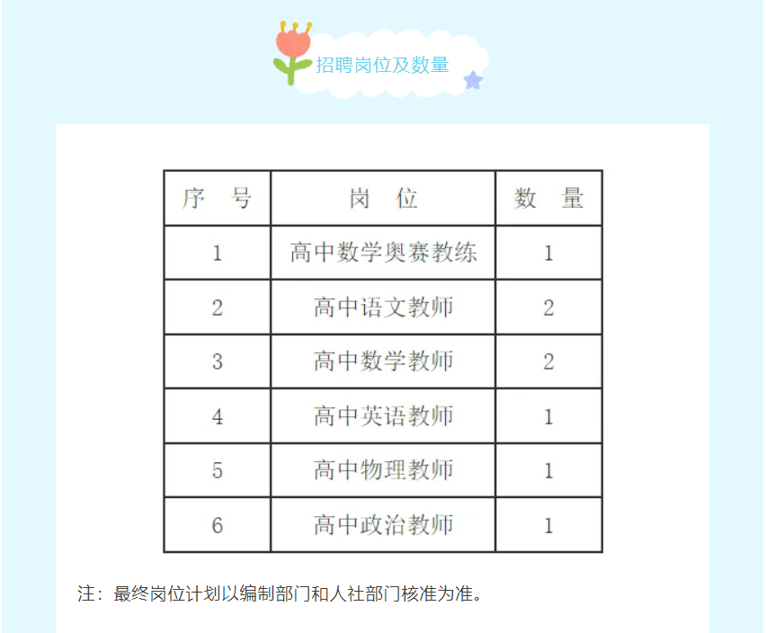 政治素质好,热爱教育事业,遵纪守法,品行端正,敬业爱生,具有吃苦耐劳、团结协作、乐于奉献的精神,服从工作安排。最终招聘相关条件以人社部门核批为准。