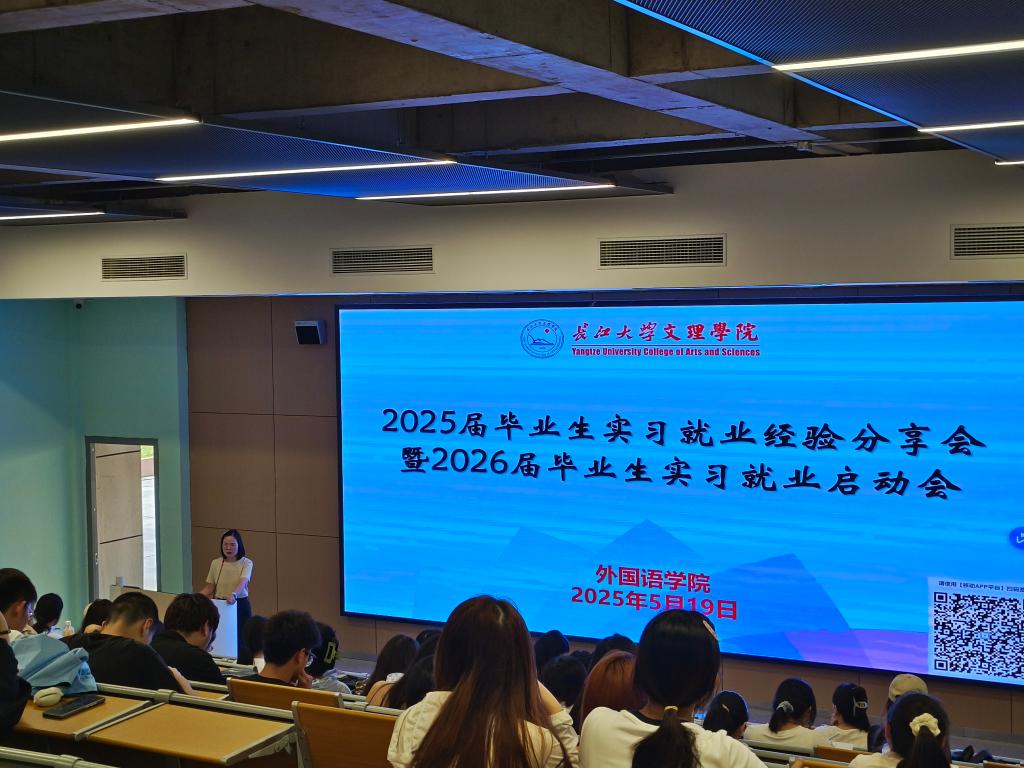 本网讯(通讯员 孟鑫竹)为推动毕业生实现精准就业、高质量就业,树立正确的就业观、择业观,提升就业能力,5月19日下午教学楼B-214,外国语院举办2025届毕业生实习就业经验分享会暨2026届毕业生实习就业启动会。太阳集团122cc副经理罗丹、商务英语教研室主任李琳老师、辅导员许静婷、侯韦,2025届优秀毕业生及2026届毕业生近150人到场参加。