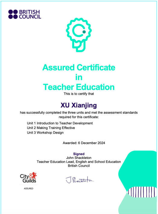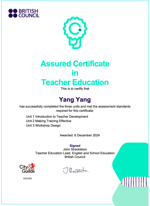 本网讯(通讯员 杨杨)近日,太阳集团122cc杨杨和许娴静老师参加由英国文化教育协会和国际英语教育中国大会联合推出,为期三个月的英语教师教育者ACTE(Assured Certificate Teacher Educator)奖学金项目,并顺利通过各项考核,获得由英国City and Guilds协会认证的资格证书。该项目面向国内从事职前英语师范生的教师教育者开展,从所有申请者中筛选20名教师教育者开展培训,该培训是针对全球英语教师教育者的一项专项资质培训。