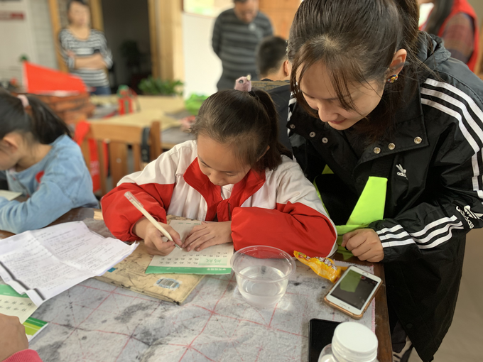上午九点,志愿者来到锣山书院,推开书院的大门,眼前的景况陌生而熟悉。教室是出奇的温馨,孩子们的书法整齐的放在桌子上。再次在此开展支教志愿者们轻车熟路,很快以年级为单位分好小组。课程内容以拓展巩固课内知识为主,志愿者们对孩子们耐心讲解,悉心辅导。支教战友们彼此都很放得开,使得活动顺利开展。