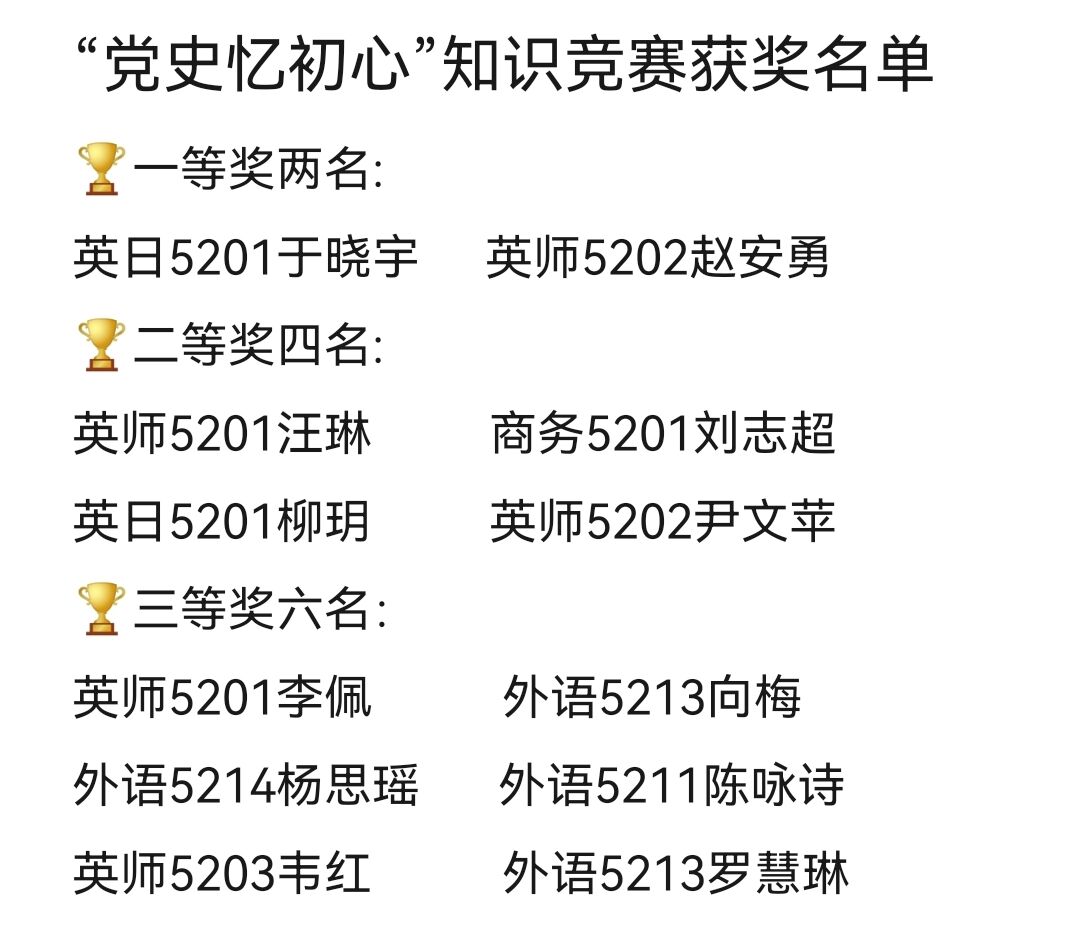 本次活动旨在激发学党史热情,增强知党恩意识。以知识问答的形式考察参赛者对党史的了解程度。活动过程中,同学们积极配合,冷静思考,认真答题。竞赛获奖名单如下: