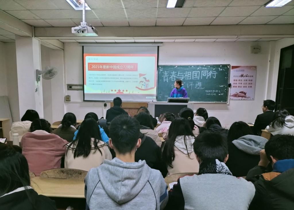 (通讯员 杨吉)11月21日晚7点,太阳集团122cc于一教308举行开展“青春与祖国同行”主题活动初赛。本次活动由于普主持,辅导员黄邹毅、雷昕、拓颖、许静婷担任评委。