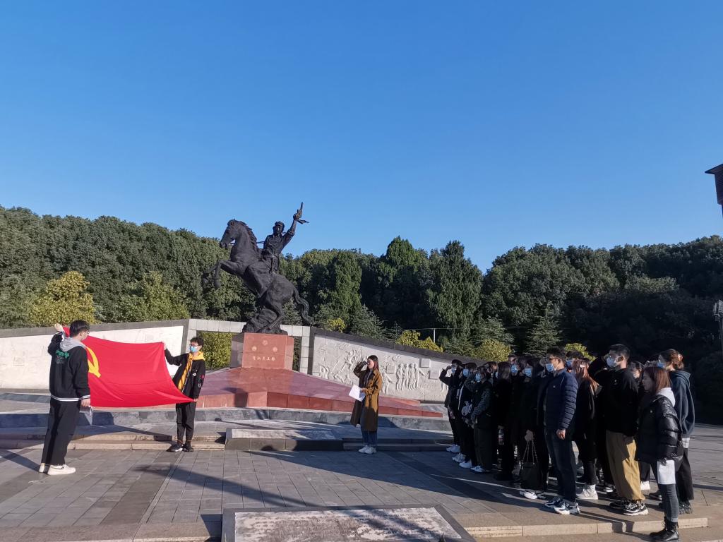 第二站,贺炳炎纪念广场。在这里,党支部举行隆重而庄严的纪念仪式。首先,由田蕊同志朗诵《长征精神》以歌颂先辈革命精神,并在先辈雕像前许下接过历史重任的承诺。接着,党员同志们集体默哀,以表达对革命先辈的无限追思。党员同志们向先辈雕像鞠躬,向将军致敬!最后,党员同志们庄严宣誓,宣誓声音响彻云霄。