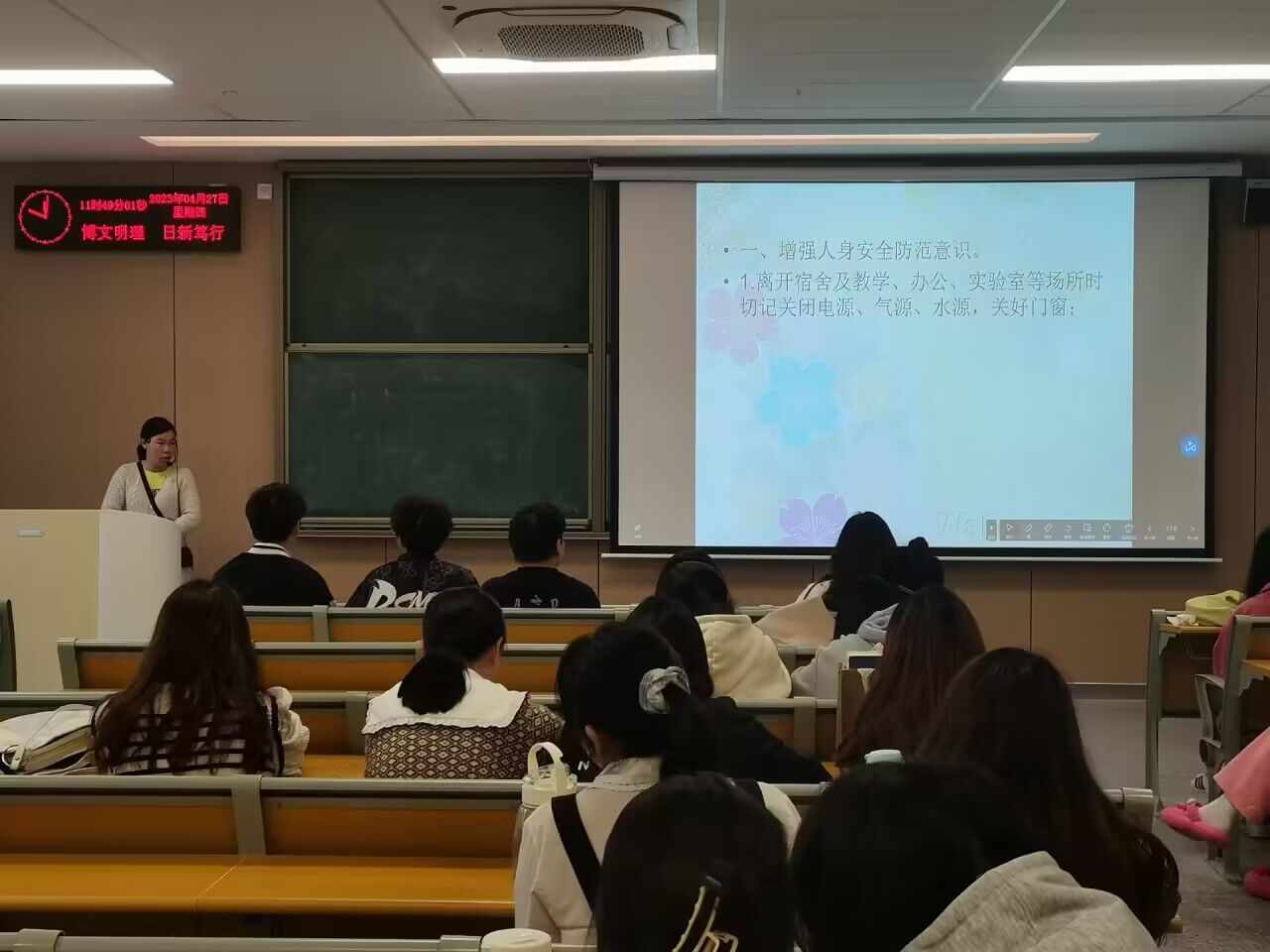班会伊始,班主任提醒同学们对于疫情形势不要放松警惕,做好个人防护。随后,就假期员工管理提出要求:员工每日按时打卡,注意寝室用电安全;外出注意交通安全,警防诈骗、溺水以及校外人身财产安全。最后,班主任预祝同学们五一假期愉快并强调不要忘记完成学业任务。