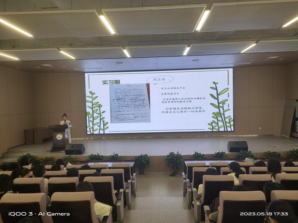 在分享会上,商务英语方向王燕燕、李如菲、王昊洋、刘杨四位同学分享介绍了自己的求职感悟和实习就业经验。重点分享了制作投递简历、筛选招聘信息、面试技巧等方面的心得体会。鼓励大家积极探索、不断积累求职应聘经验,最终找到理想的工作岗位。英语师范方向余梦琴、王玉君、陈方芳三位同学分享了自己在实习公司工作期间的内容和职责,包括教学设计、班级管理、课后服务等多个方面。同时表示,在实习过程中自己的教学能力和管理能力得到了极大的提升。