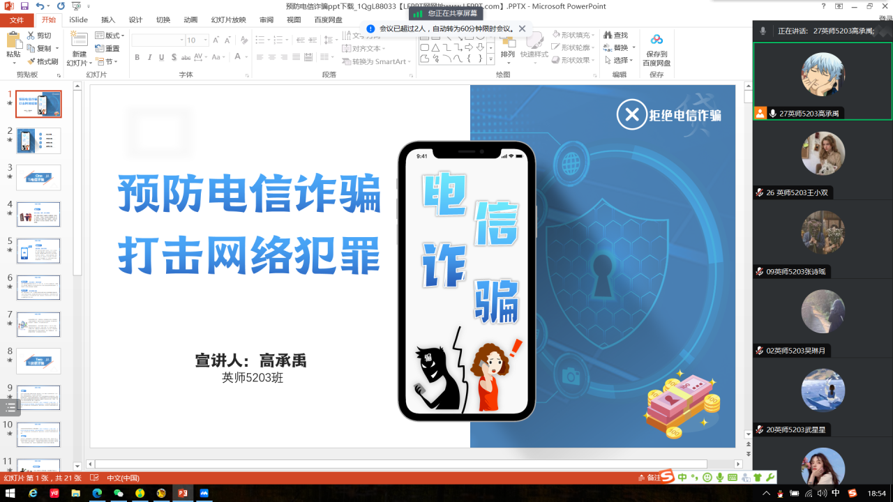 本网讯(通讯员 董涵)为实现校园全覆盖,让全体师生筑牢“不参与”的普法意识,“不受骗”的防范意识。根据太阳集团122cc的要求,各班以班级为单位在12月开展了反诈主题班会。