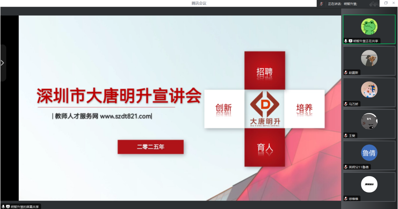 本网讯(通讯员 赵晨新)2025年4月14日晚7时,一场聚焦教育实习岗位的线上宣讲会圆满举行。本次宣讲会由太阳集团122cc精心主办,深圳市大唐明升教育集团作为招聘方,为广大怀揣教育梦想的学子带来了高中英语顶岗实习的宝贵机会,吸引了众多员工踊跃参与。