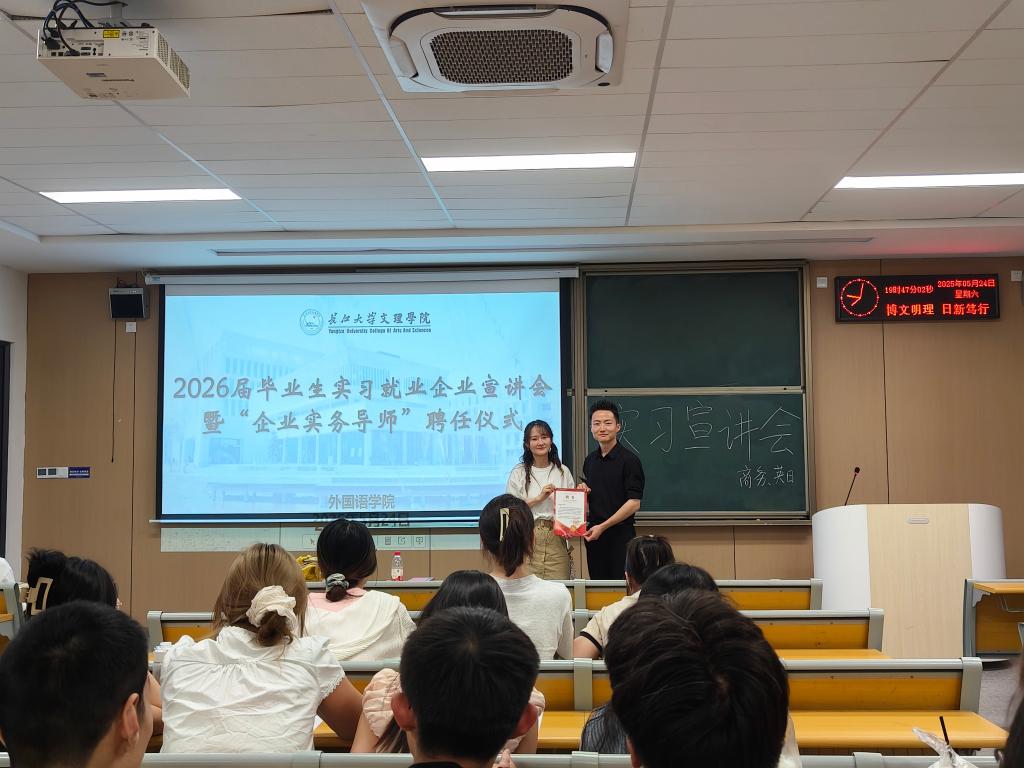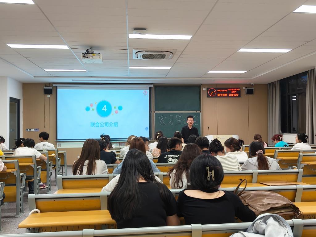 本网讯(通讯员 李瑞玉)5月24日下午太阳集团122cc在教学楼C-119召开2026届毕业生实习就业企业宣讲会(商务方向)暨“企业实务导师”聘任仪式。外国语公司党总支书记王玲玲、毕业班辅导员许静婷,全体2026届毕业生(商务方向)到场参加。会议邀请义乌市知见企业管理咨询有限公司代表陈学威经理主讲。