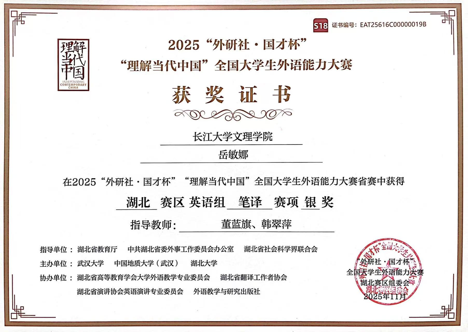 本次大赛由湖北省教育厅、中共湖北省委外事工作委员会办公室及湖北省社会科学界联合会联合指导,吸引了来自武汉大学、华中科技大学、华中师范大学等全省多所高等院校的精英学子同台竞技,赛事规格高、竞争激烈。经过紧张而严谨的评审角逐,岳敏娜、严珮榕两位同学凭借扎实的语言功底与良好的专业素养喜获佳绩,充分展现了公司外语人才培养的质量与成效。
