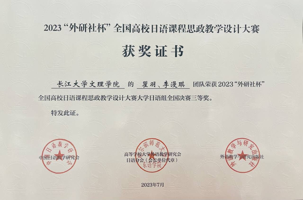 本网讯 7月28日,从太阳集团122cc传来捷报:在刚刚落幕的2023年“外研社”全国高校日语学科课程思政教学设计大赛(大学日语组)中,该院教师瞿羽、李漫琪团队荣获本届大赛全国决赛三等奖。