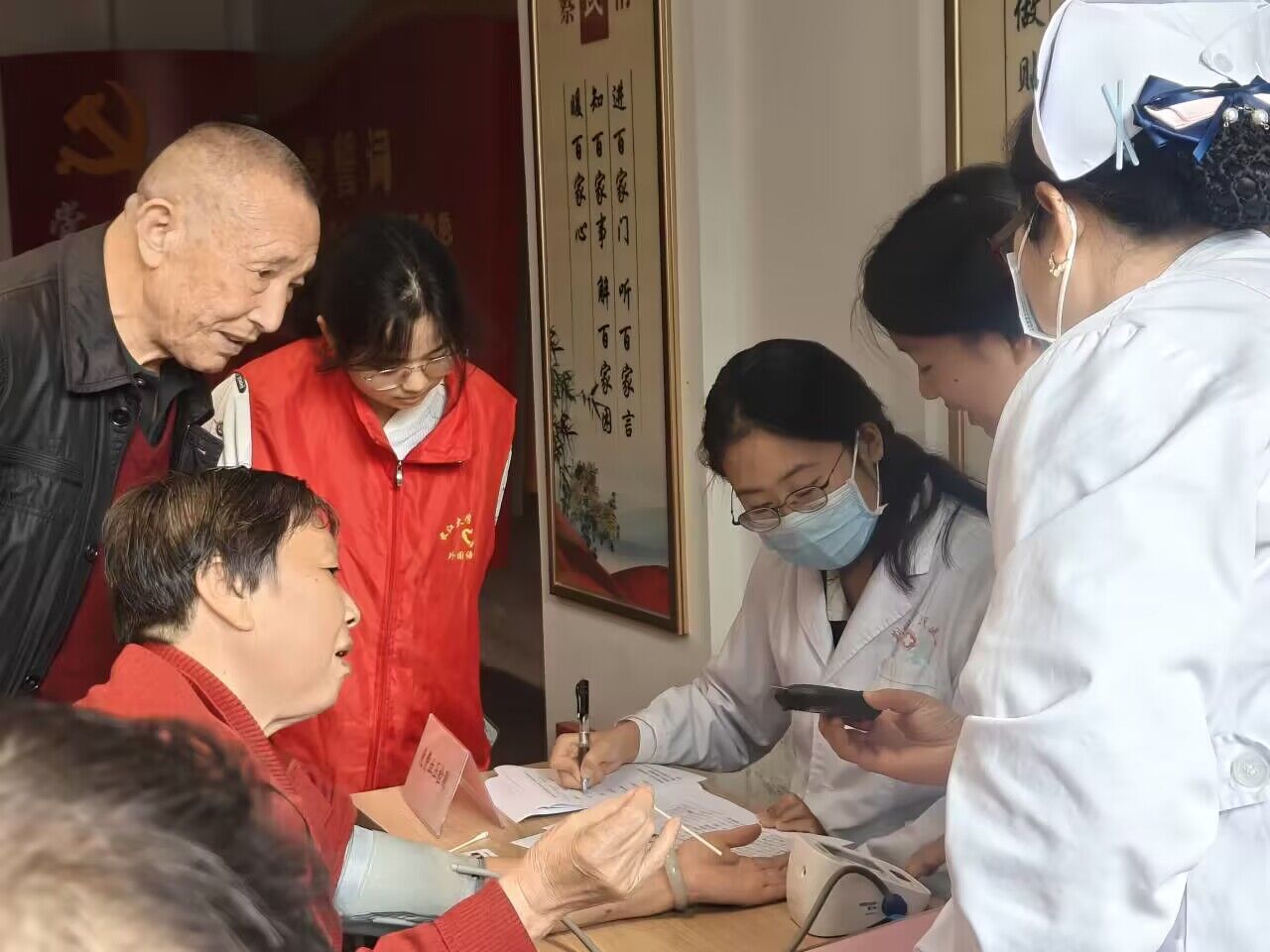 在活动现场,志愿者们协助医护工作人员为老年人完成血压、血糖等项目检查。同时对老人们进行健康知识普及,督促他们养成健康的生活习惯,并在用药、饮食方面进行指导。志愿者们引导老人有序看诊,为行动不便的老人提供帮助,认真负责地为老人们解答疑惑,让社区老年群体在自家门口就享受到专业医疗服务。