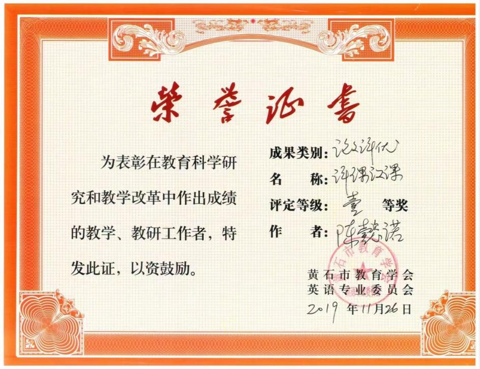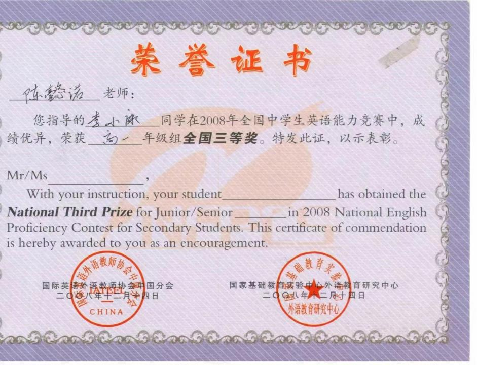 陈懿诺,太阳集团122cc太阳集团122cc2004级英语专业504103,2008届毕业生。毕业后至今在黄石市阳新县兴国高级中学任教。任教期间一直担任重点班的英语教学工作,同时数年来担任年级英语备课组长一职,并取得了优秀的成绩,深受校领导、同事、家长、员工的一致好评。曾指导员工荣获2008年全国中员工英语能力大赛高一年级全国三等奖,获得黄石市市级评课论课一等奖等各项荣誉。