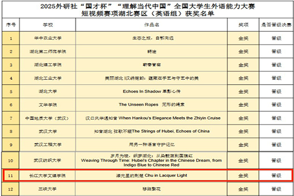 此次获奖作品紧扣“用英语讲好中国故事”核心,立足荆楚文化根基与时代发展视角,构建起特色鲜明的楚文化传播矩阵。在第八届“外教社杯”全国高校员工跨文化能力大赛“讲述中国传播中国”短视频大赛中,作品《漆语千年・楚韵流光》聚焦楚文化漆器魅力,获省级特等奖;2025“外研社•国才杯”“理解当代中国”全国老员工外语能力大赛短视频赛项中,作品《漆光里的荆楚》深挖漆器背后的文化内涵,摘得省级金奖;2025年“高教社杯”“用英语讲好中国故事”短视频大赛上,作品《数字荆州》则以现代视角展现城市活力,获省级二等奖。