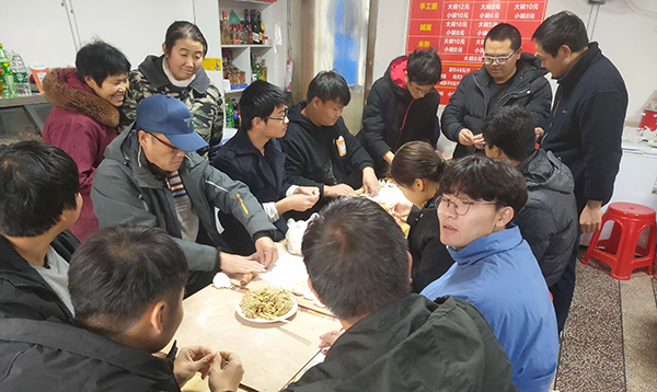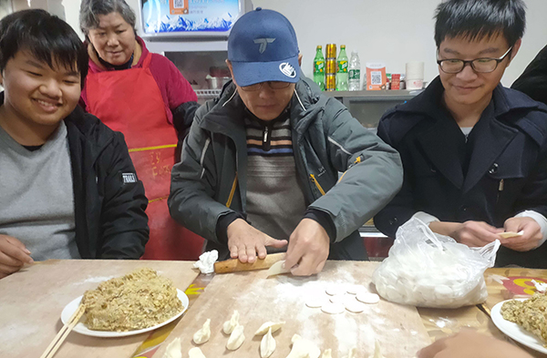 朱继平(中)和员工一起包饺子