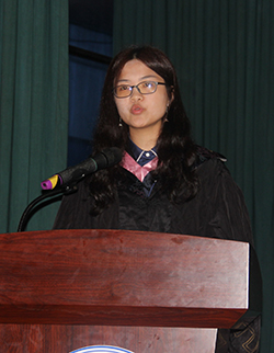 毕业生代表李雯在发言中表达自己对母校的感恩之心,并向师长致以崇高的敬意。她代表2019届全体毕业生郑重承诺:未来,将牢记师恩,带着父母的嘱托和学弟学妹的祝福,扬帆致远,奋勇前行,实现理想,做无愧于母校、无愧于自己、无愧于祖国、无愧于时代的文理人。