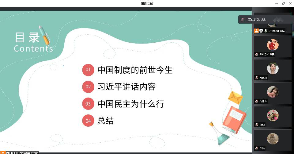 团课中,虽然同学没能聚在一起学习这堂主题团课,但依旧不减同学们的积极和热心,同学们在线上“云视频”的科技交互下,使本次团课更加生动活跃。各班同学在团支书的带领下,通过讲述,观影习总书记讲话片段,互动问答等新颖的形式,了解本次团课的意义。各院(系,部)团课内容丰富,形式多样,氛围活跃。员工们参与度高,让员工们在轻松愉悦的团课中学习党中央统筹中华民族伟大复兴战略全局和世界百年未有之大变局,从坚持和完善党的领导、巩固中国特色社会主义制度的战略高度出发,继续推进人民代表大会制度理论和实践创新,提出的一系列新理念新思想新要求。增强中国青年使命感,责任感。