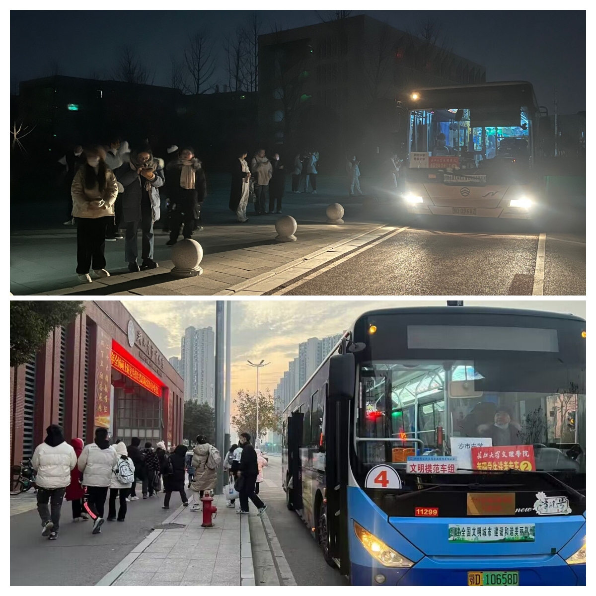 1223-24日凌晨6:30分,五辆大巴已整齐停放于图书馆门口,为全院200名考研学子进行爱心送考。员工工作处处长李刚英,各教学单位相关负责人和辅导员到现场为考研学子送考。