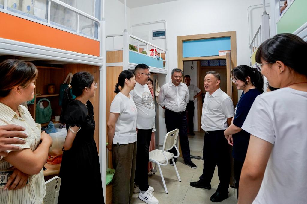 “老家是哪里的呀?”“对公司宿舍还满意吗?还有什么需求吗?”……一声声亲切的问候温暖了同学们的心。在走访过程中,校领导与同学们和家长进行了亲切交谈,详细询问了到校感受和入住情况,叮嘱同学们要注意宿舍安全及用电安全,提高安全防范意识。