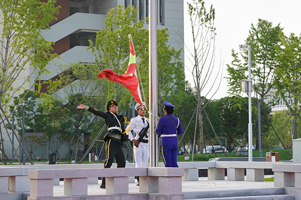 7时,升国旗仪式正式开始。国旗护卫队护送五星红旗正步走向升旗台。伴随着激昂的《义勇军进行曲》,全体师生齐唱国歌,注视着五星红旗冉冉升起。
