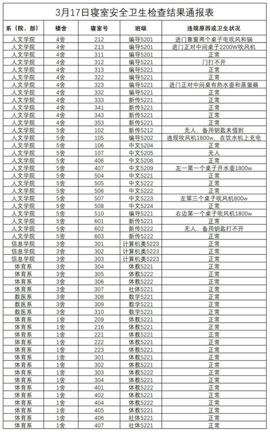2022-2023学年第二学期第五周寝室安全卫生抽查结果通报