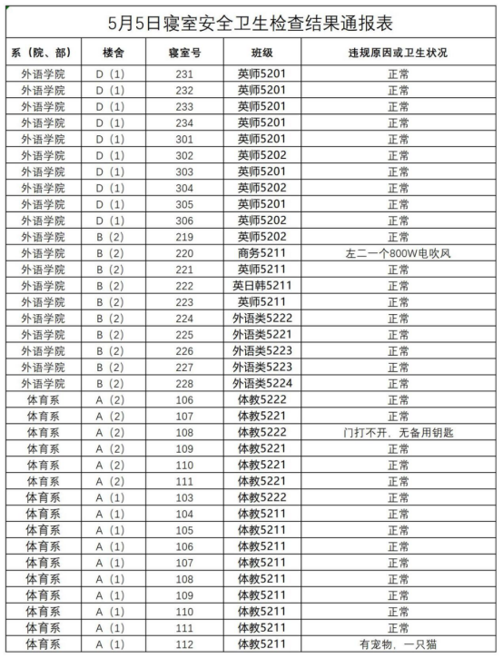 2022-2023学年第二学期第十二周寝室安全卫生检查结果通报