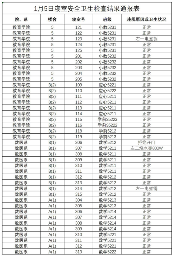 2023-2024学年第一学期第十九周寝室安全卫生检查结果通报