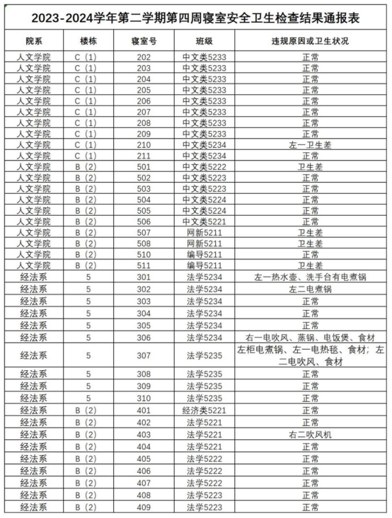 2023-2024学年第二学期第四周寝室安全卫生检查结果通报