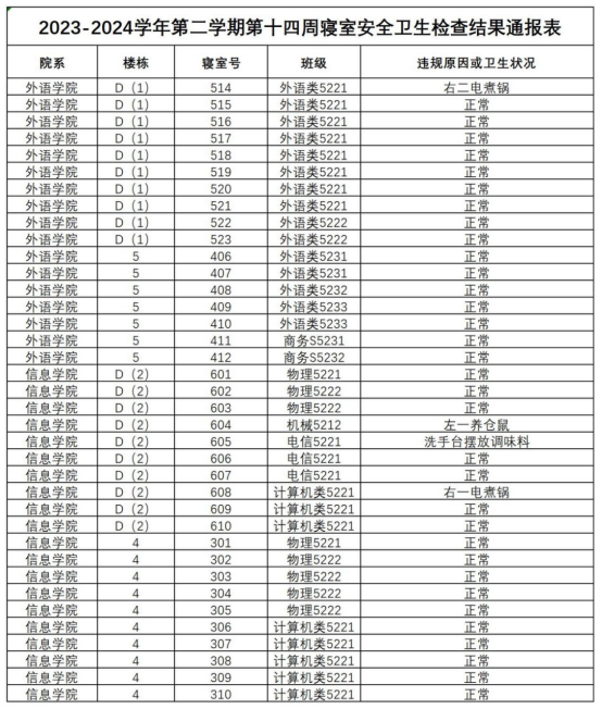 2023-2024学年第二学期第十四周寝室安全卫生检查结果通报