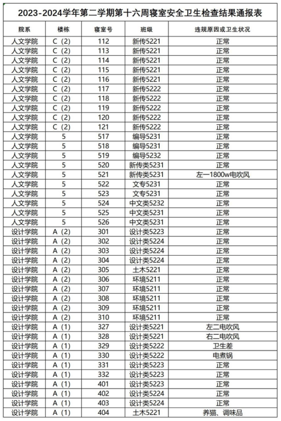 2023-2024学年第二学期第十六周寝室安全卫生检查结果通报