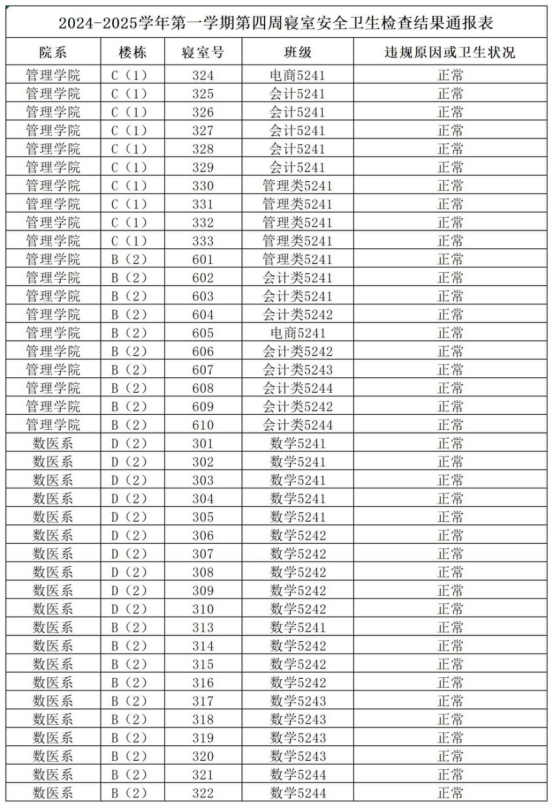 2024-2025学年第一学期第四周寝室安全卫生检查结果通报