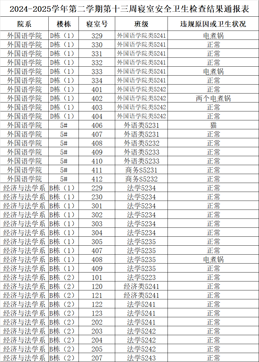 2024-2025学年第二学期第十三周寝室安全卫生检查结果通报表