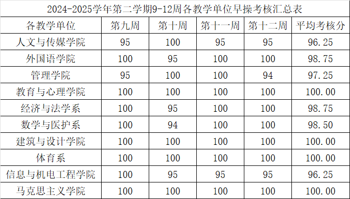 2024-2025学年第二学期9-12周各教学单位早操考核汇总表