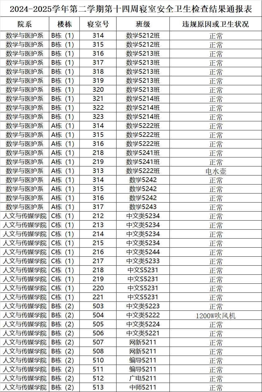 2024-2025学年第二学期第十四周寝室安全卫生检查结果通报表