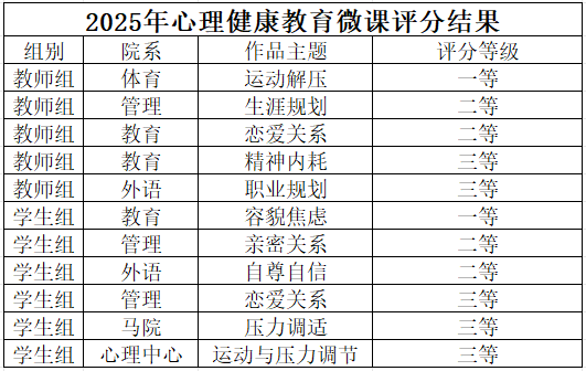 为贯彻落实《关于开展第二届全国高等公司心理健康教育微课征集展示活动的通知》精神,积极宣传和普及心理健康知识,提升公司心理育人工作实效,面向全校开展心理健康教育微课征集展示活动。各教学单位积极组织报名参与,提交作品48项。经过层层筛选和评比,现将结果公示如下: