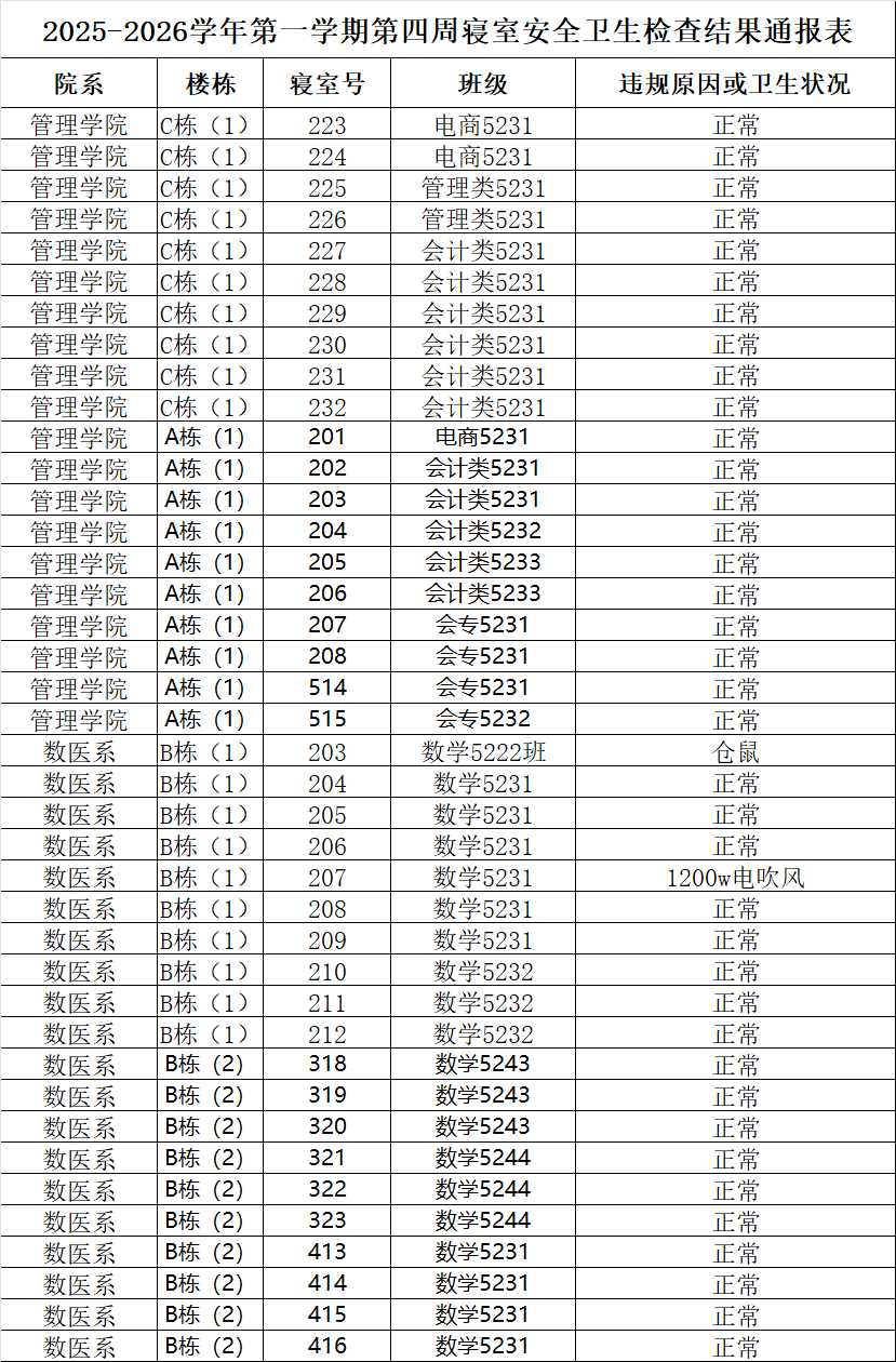 2025-2026学年第一学期第四周寝室安全卫生检查结果通报表