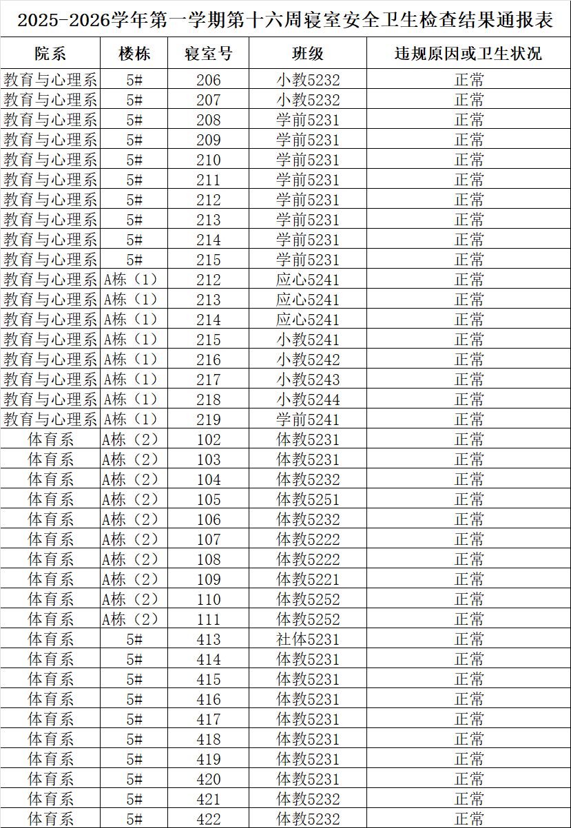 2025-2026学年第一学期第十六周寝室安全卫生检查结果通报表