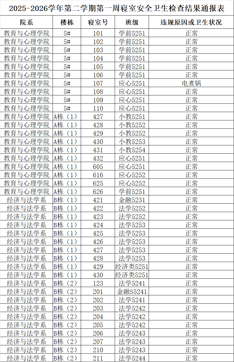 2025-2026学年第二学期第一周寝室安全卫生检查结果通报表