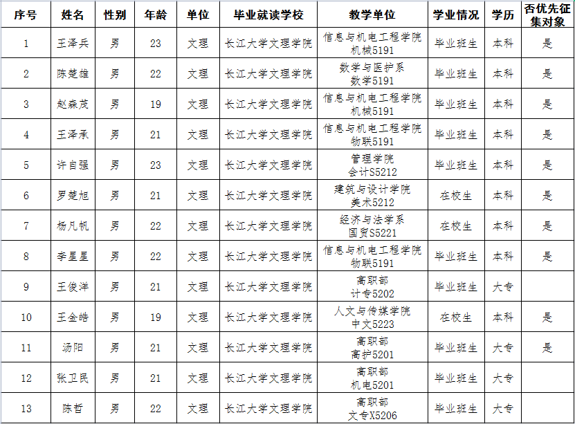 通过荆州区武装部组织的体检、政审考核、心理测试、役前训练等环节,公司王泽兵等13名同学经湖北省荆州市荆州区人民政府征兵办公室批准光荣入伍,现根据相关规定予以公示,公示时间为2023年3月13日至3月17日。如有异议,请在公示期内向公司纪检监察部或荆州区武装部进行反映。