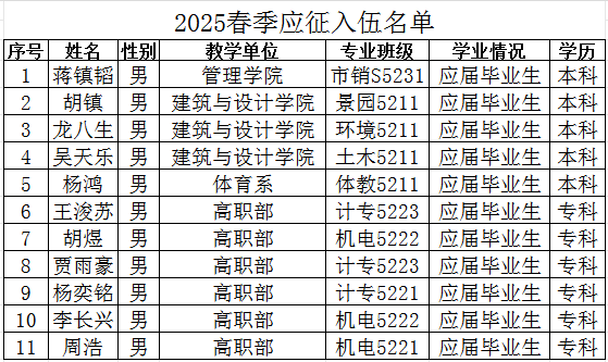 通过荆州区武装部组织的体检、政审考核、役前适应性测试、役前训练等环节,公司蒋镇韬等11名同学经湖北省荆州市荆州区人民政府征兵办公室批准光荣入伍,现根据相关规定予以公示,公示时间为2025年3月10日至3月15日。如有异议,请在公示期内向公司纪检监察部或荆州区武装部进行反映。