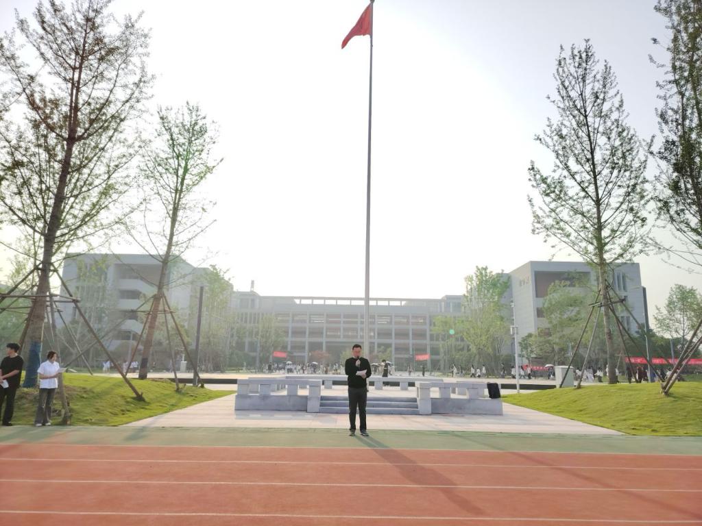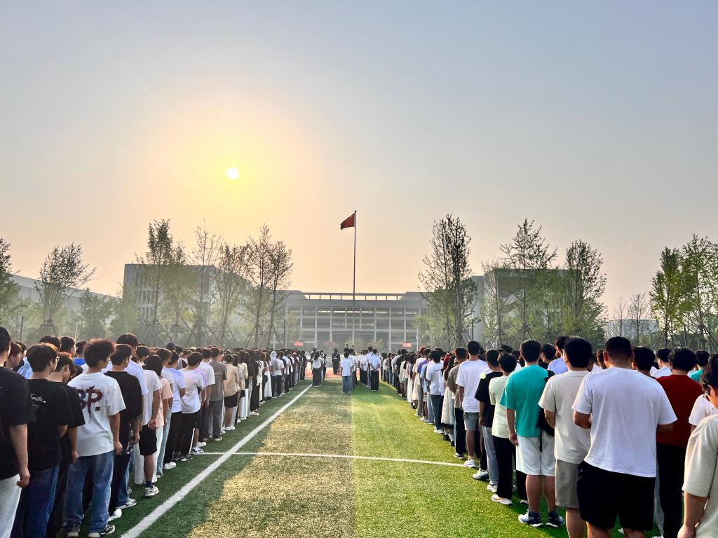 迎着东方升起的第一缕晨曦,国旗护卫队护送鲜艳的五星红旗至升旗台前。伴随着庄严的国歌声,五星红旗冉冉升起,全体师生肃立,行注目礼。