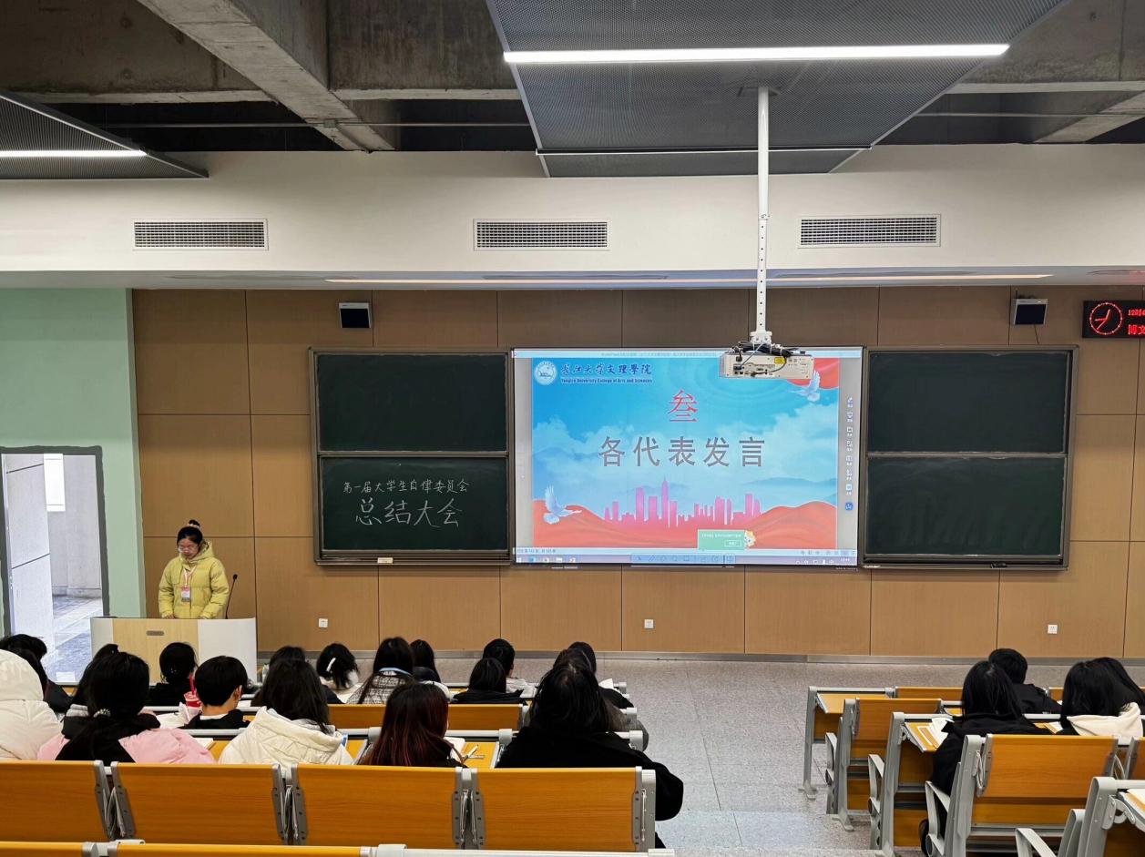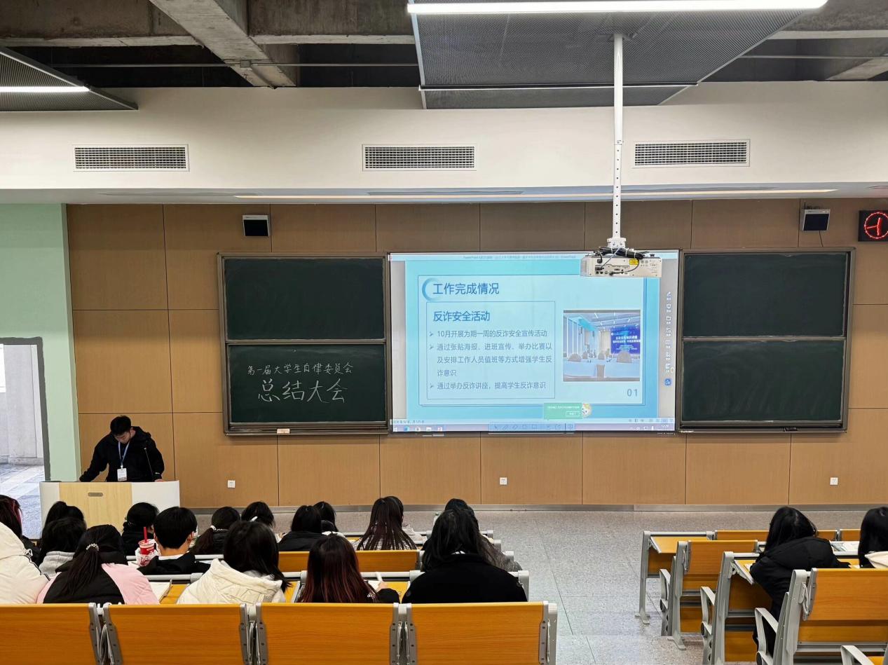 会上,老员工自律委员会各部门代表依次上台,通过图文并茂的PPT展示,详细汇报了本部门在过去一学期中组织的各项活动、完成的工作任务以及工作经验总结分析。从日常的三率考勤到抓拍校园不文明现象,从“筑牢安全防线,共筑反诈长城”到“火焰蓝,安全梦”等等,老员工自律委员会各部门在不同领域都发挥了重要作用,为丰富校园生活、营造良好校园氛围做出了积极贡献。
