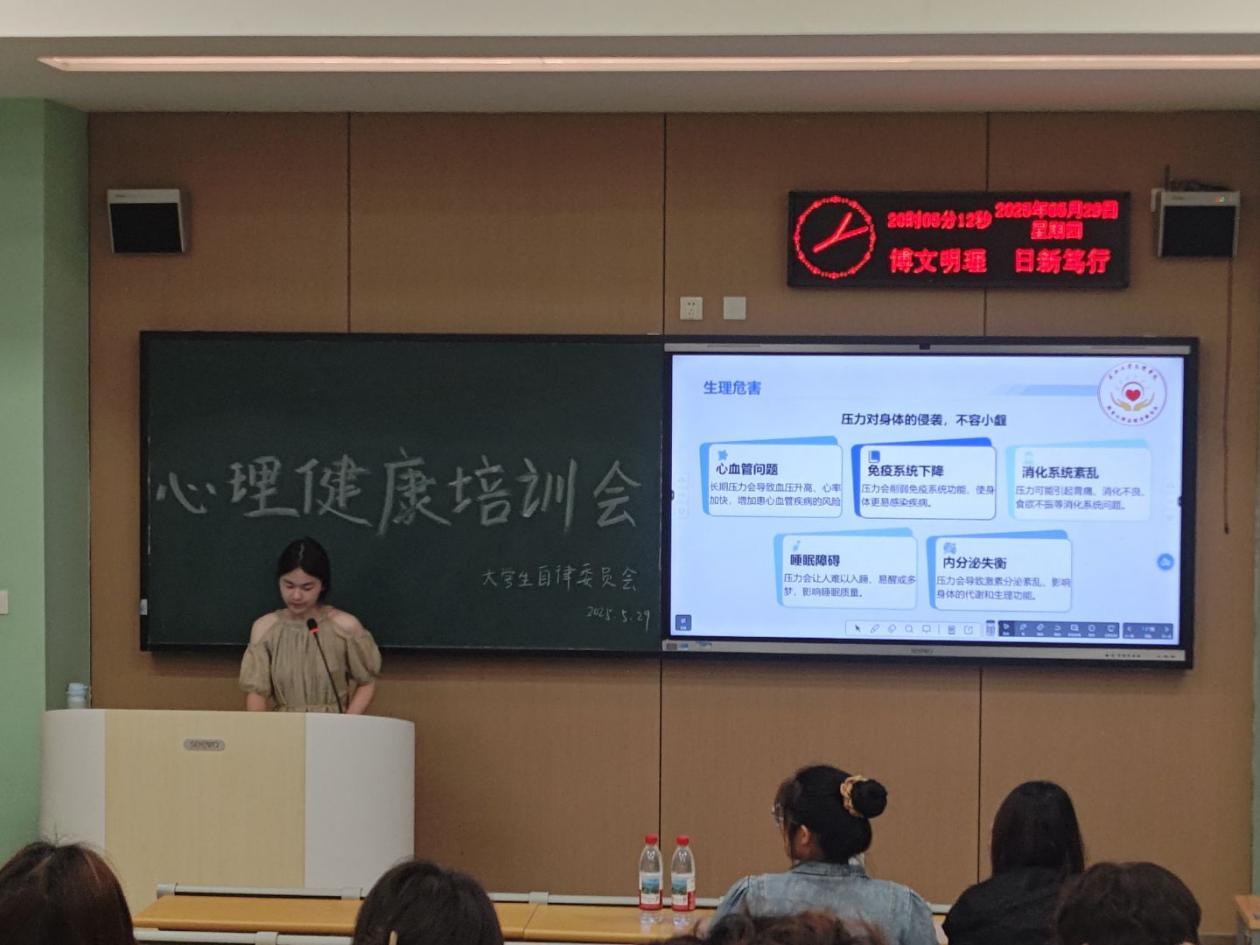 培训过程中,文振华同学为我们详细分析了压力的定义与来源、情绪的种类与影响,指出了压力的生理危害和心理危害,深入浅出地讲解了一些常见心理问题的表现形式和识别方法,帮助同学们正确认识和对待心理问题,消除对心理疾病的误解和偏见。