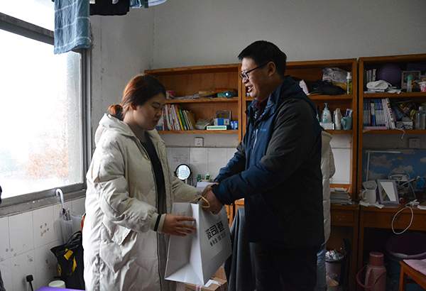 在3-408寝室,朱继平向困难生送上崭新的羽绒服,并带去院领导的真情关怀。他走到员工中间,询问同学们的学习和生活状况,了解大家的实际需求,嘱咐同学们克服天气、出行等不利因素,坚持认真学习,争取在期末考试中取得优异成绩。室外冬雨纷纷,安上空调的寝室温暖如春,在4-261寝室,张同学紧握孙细望递上的羽绒服,表示将谨记公司领导和老师们的嘱托,刻苦学习,以实际行动回报公司。
