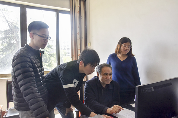 建筑与设计系主任张系斌教授(右二)和田从祥老师为陆华建(左一)、杜玉玲作赛前辅导。