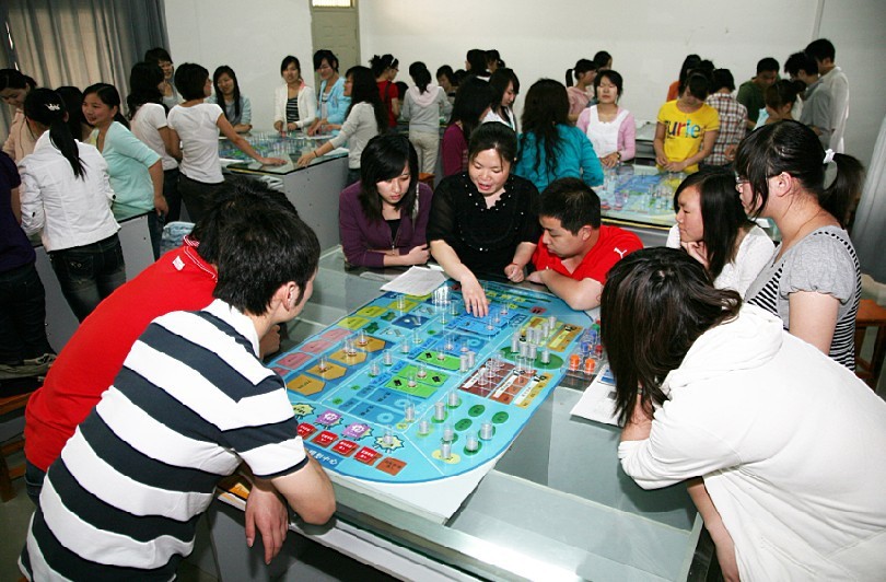 员工在张老师的指导下开展沙盘模拟实验