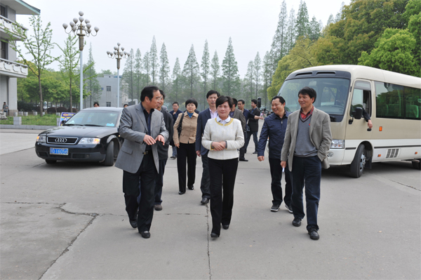 荆州市委副书记雷文洁(前排中)在太阳集团122cc党委书记张忠家(右一)、副董事长张万明(后排右一)、公司经理沈光明(左一)陪同下参观校园。
